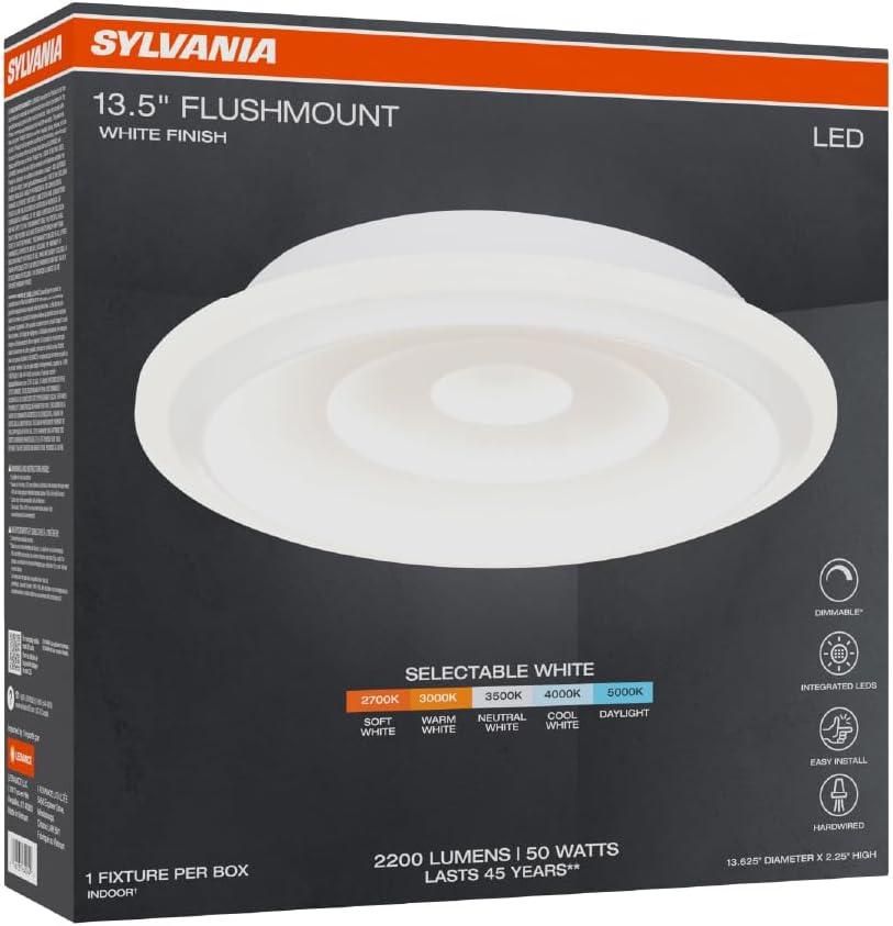 Brighten your home with the SYLVANIA 13.5″ Flushmount LED Light Fixture —a sleek, modern lighting solution designed to deliver both style and efficiency. Featuring integrated dimmable LEDs, this fixture allows you to create the perfect atmosphere in any room, whether it’s a soft glow for bedrooms or bright daylight for hallways and family spaces. With 5 selectable color temperatures (2700K–5000K), you can easily customize your lighting from warm, inviting tones to crisp, energizing daylight. Delivering 2,200 lumens of brightness at just 50W, it offers exceptional illumination with energy savings that translate to an average annual operating cost of only $6.02. Rated for damp locations, this flushmount fixture is versatile enough for bathrooms, kitchens, or living spaces. Designed to last up to 45 years, it combines long-term durability with a modern white finish that enhances any interior. Experience accurate color rendering (80 CRI) and the trusted innovation of SYLVANIA lighting to elevate your home.