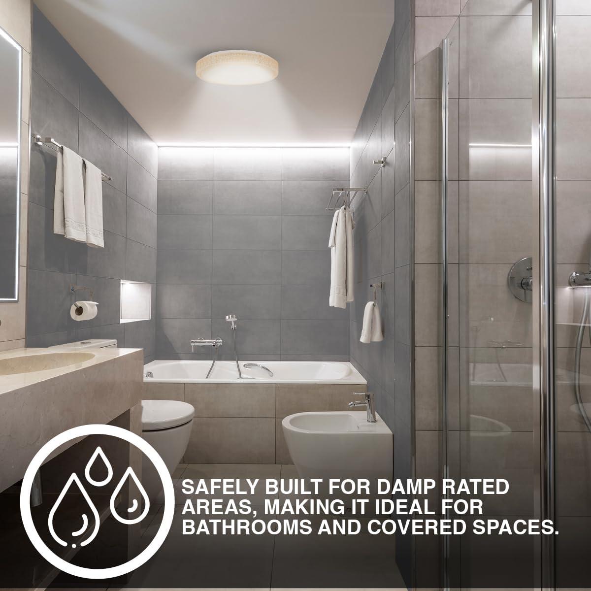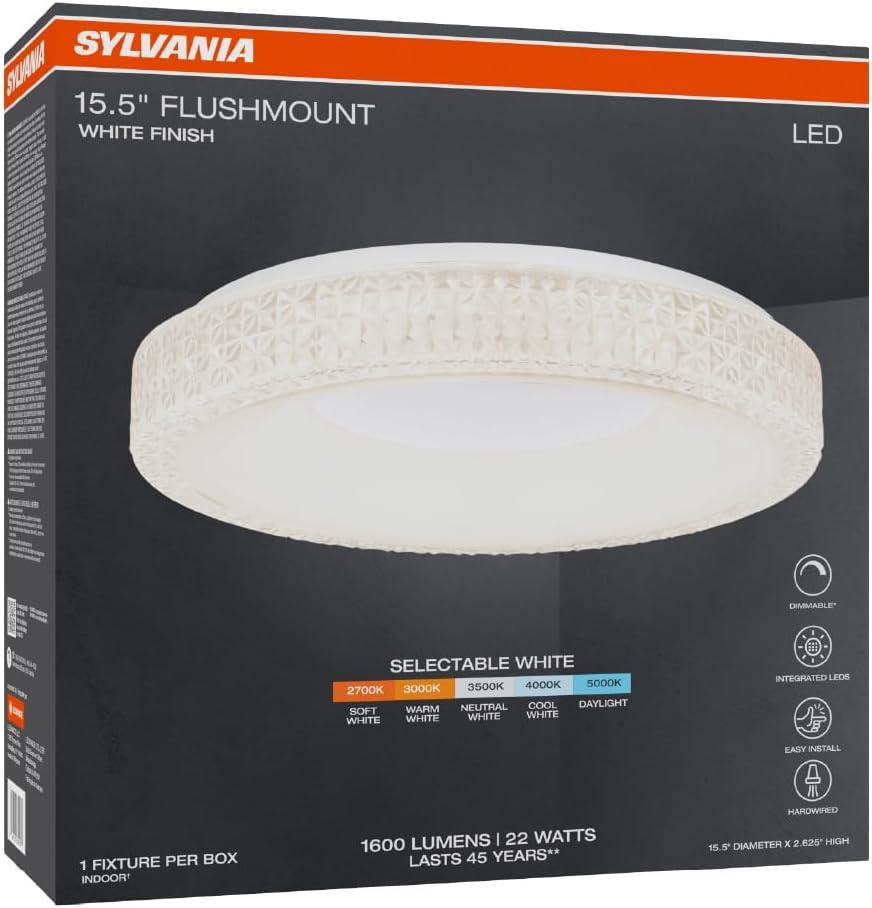 Transform your space with the SYLVANIA 15.5″ Flushmount LED Light Fixture, a modern and versatile lighting solution designed for both style and efficiency. Featuring integrated dimmable LEDs with five selectable color temperatures (2700K–5000K), this flushmount adapts to any mood or activity, from warm, cozy light to bright, productive daylight. At just 22 watts, it delivers a powerful 1600 lumens of brightness while keeping energy costs low—averaging only $2.65 per year. Built with a sleek white finish and measuring 15.5″ in diameter by 2.6″ high, it’s ideal for bathrooms, bedrooms, hallways, foyers, and other indoor spaces. Rated for damp locations, this fixture provides flexibility for installation in a variety of environments. With a 45-year lifetime and a 5-year promise, the SYLVANIA flushmount fixture ensures long-lasting performance backed by a brand trusted for over a century in lighting innovation.