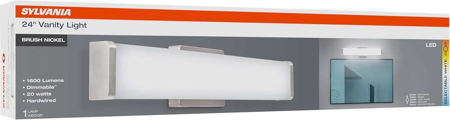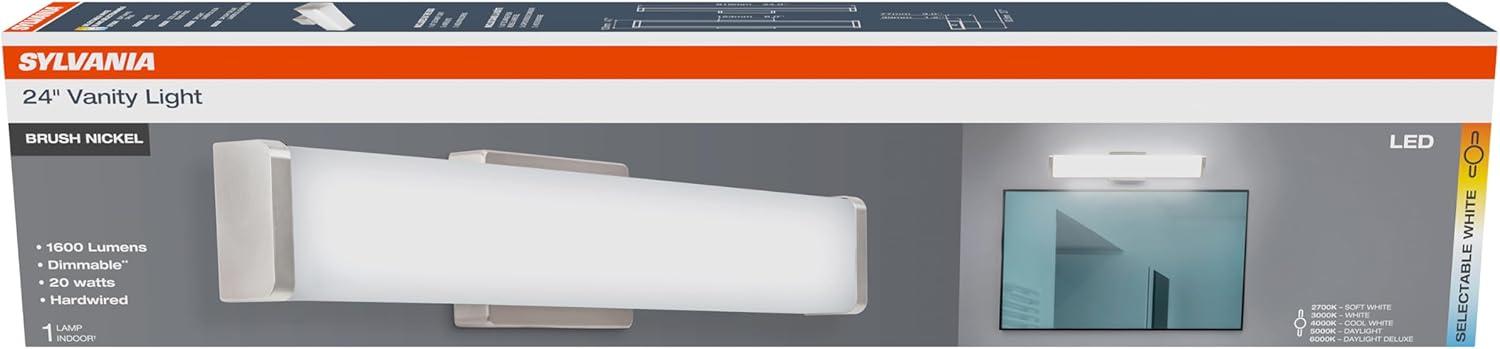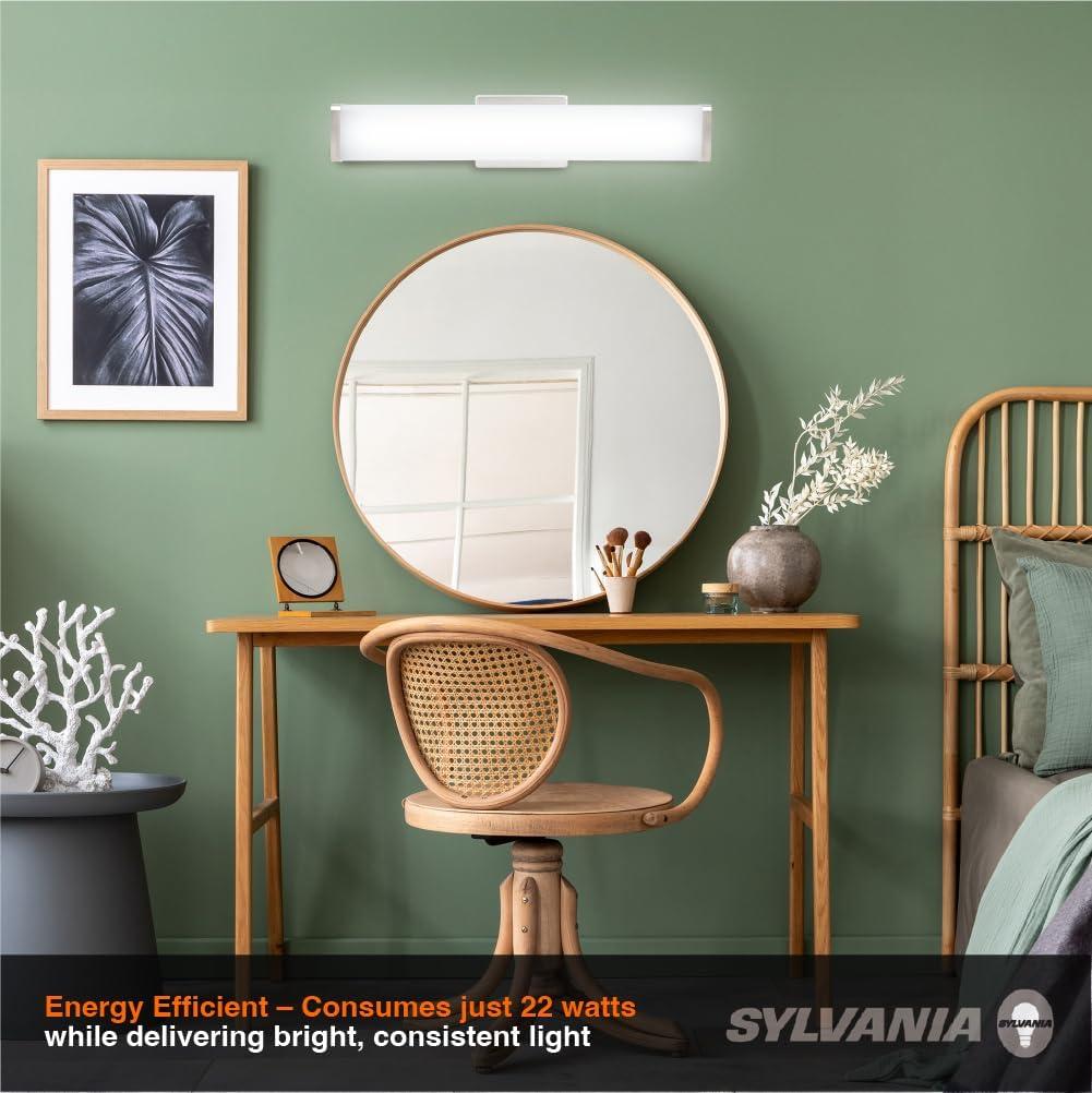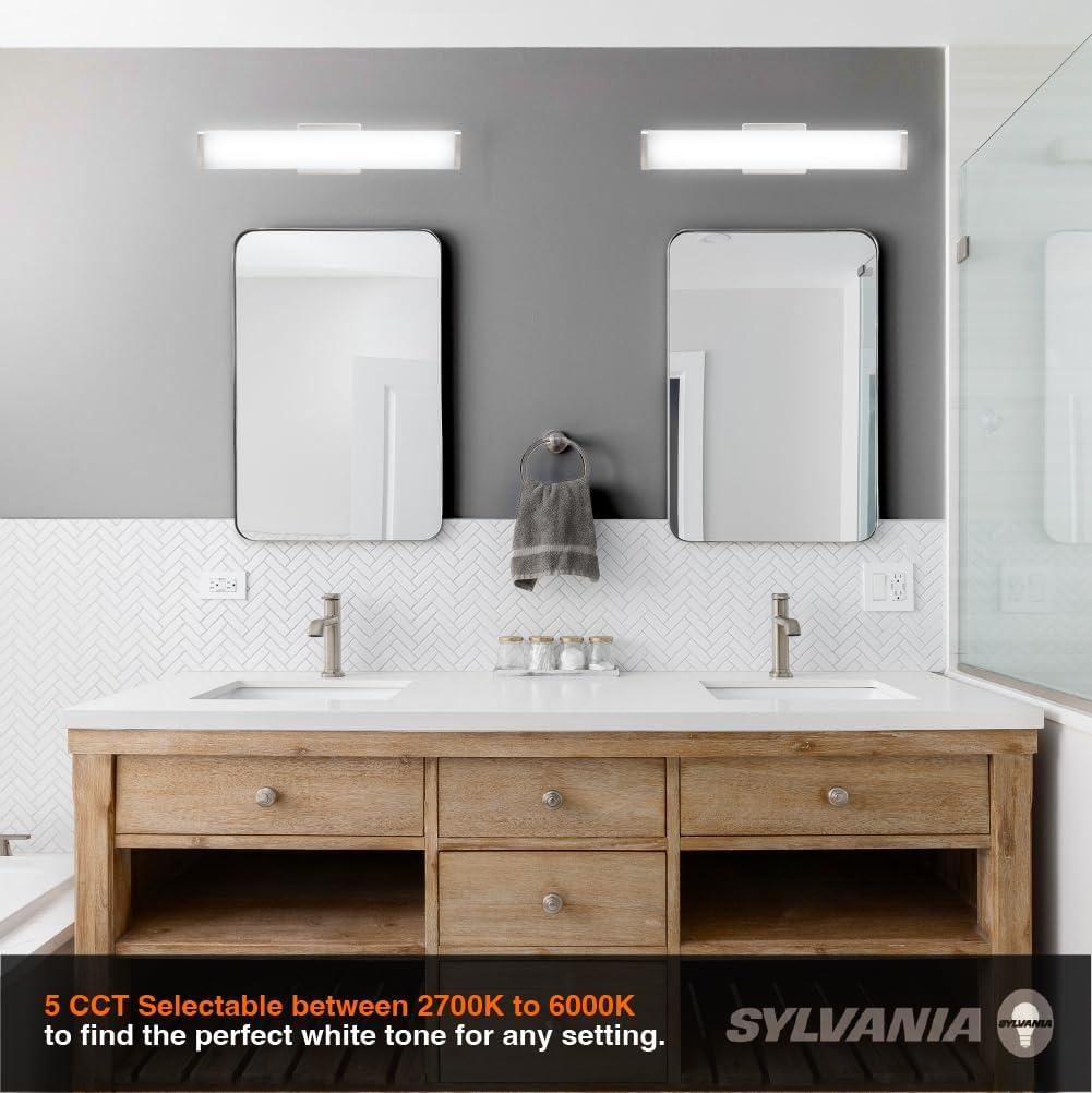 Upgrade your bathroom or vanity space with the sleek, modern brilliance of the SYLVANIA 24″ Vanity LED Light Fixture. Designed to blend contemporary style with high-performance lighting, this fixture features five selectable color temperatures ranging from a warm 2700K to a crisp daylight 6000K – so you can tailor your lighting to match your mood or décor. Key Features: 5 CCT Selectable – Easily switch between 2700K, 3000K, 3500K, 4000K, and 6000K to find the perfect white tone for any setting. Fully Dimmable – Compatible with most dimmers for smooth brightness control to set the ideal ambiance. Sleek Square Design – Stylish brush nickel finish and clean shape adds a modern touch to any bathroom, vanity, or hallway. Energy Efficient – Consumes just 22 watts while delivering bright, consistent light – helping reduce your energy bills. All Accessories Included – Comes with everything you need for a quick and easy installation. Perfect for both residential and commercial applications, the SYLVANIA 24″ Vanity LED Light Fixture combines flexibility, elegance, and efficiency in one compact package.