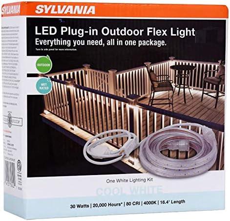 SYLVANIA LED Plug-In Outdoor Flex Light offers a complete solution for your lighting needs. Suitable for outdoor use year-round. The kit includes: (1) LED Light Strip with endcap, (1) AC power cord, clips and screws, as well as a full guide to installation.