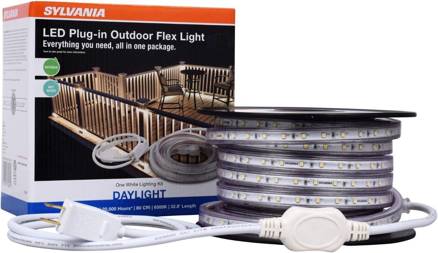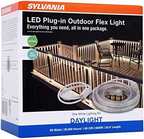 SYLVANIA LED Plug-In Outdoor Flex Light offers a complete solution for your lighting needs. Suitable for outdoor use year-round. The kit includes: (1) LED Light Strip with endcap, (1) AC power cord, clips and screws, as well as a full guide to installation.
