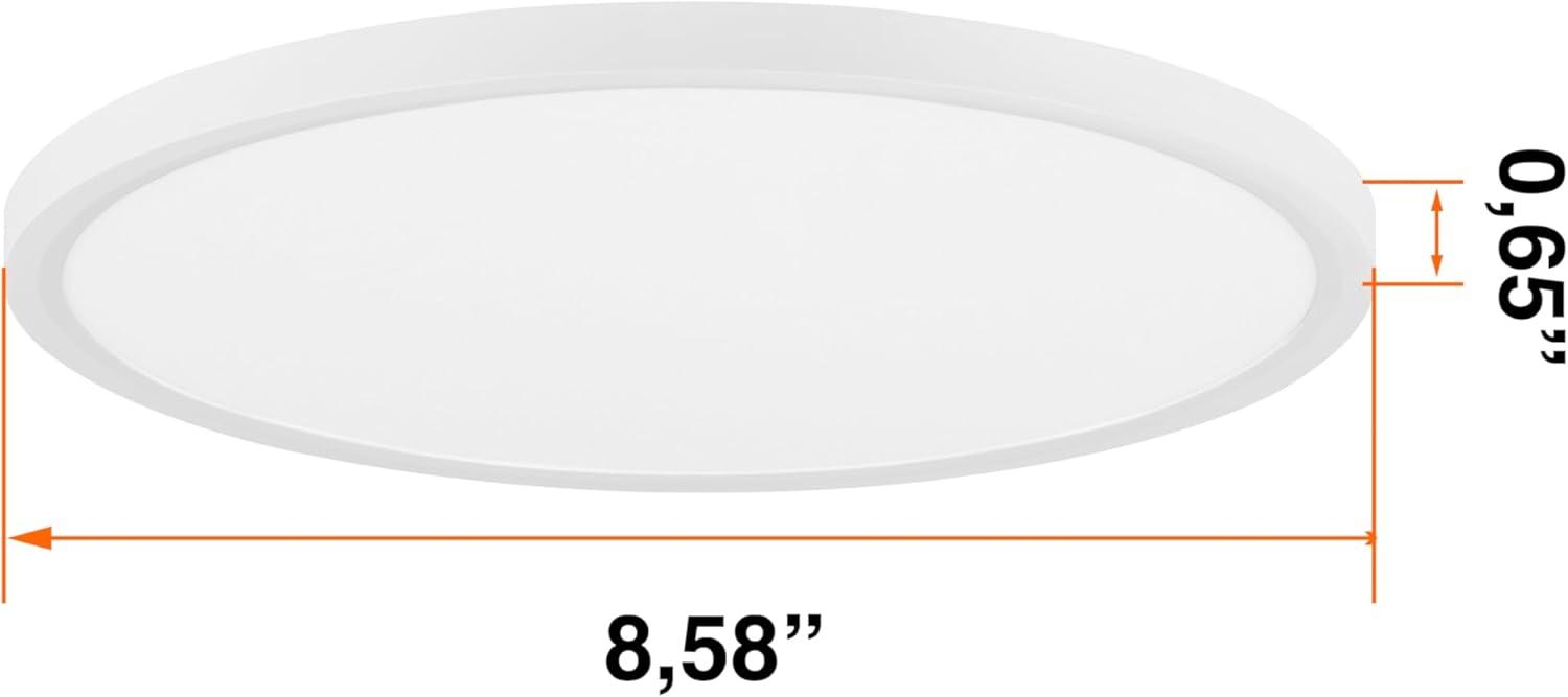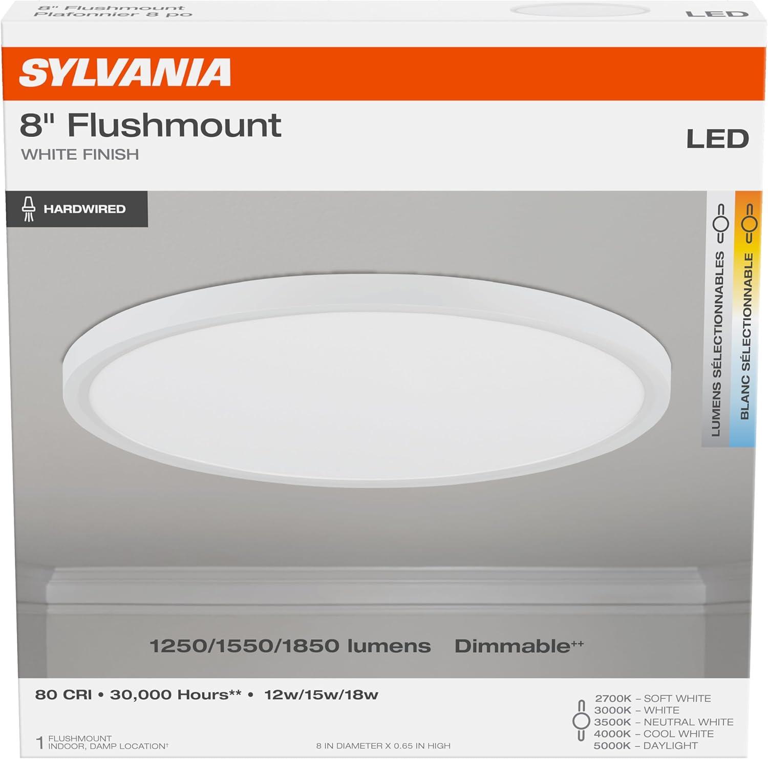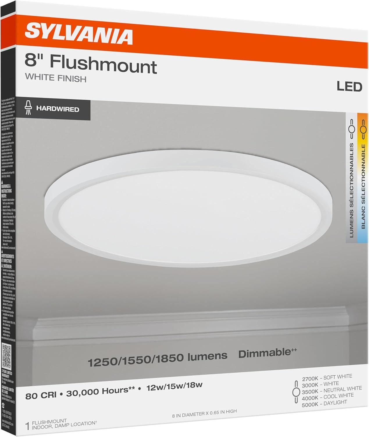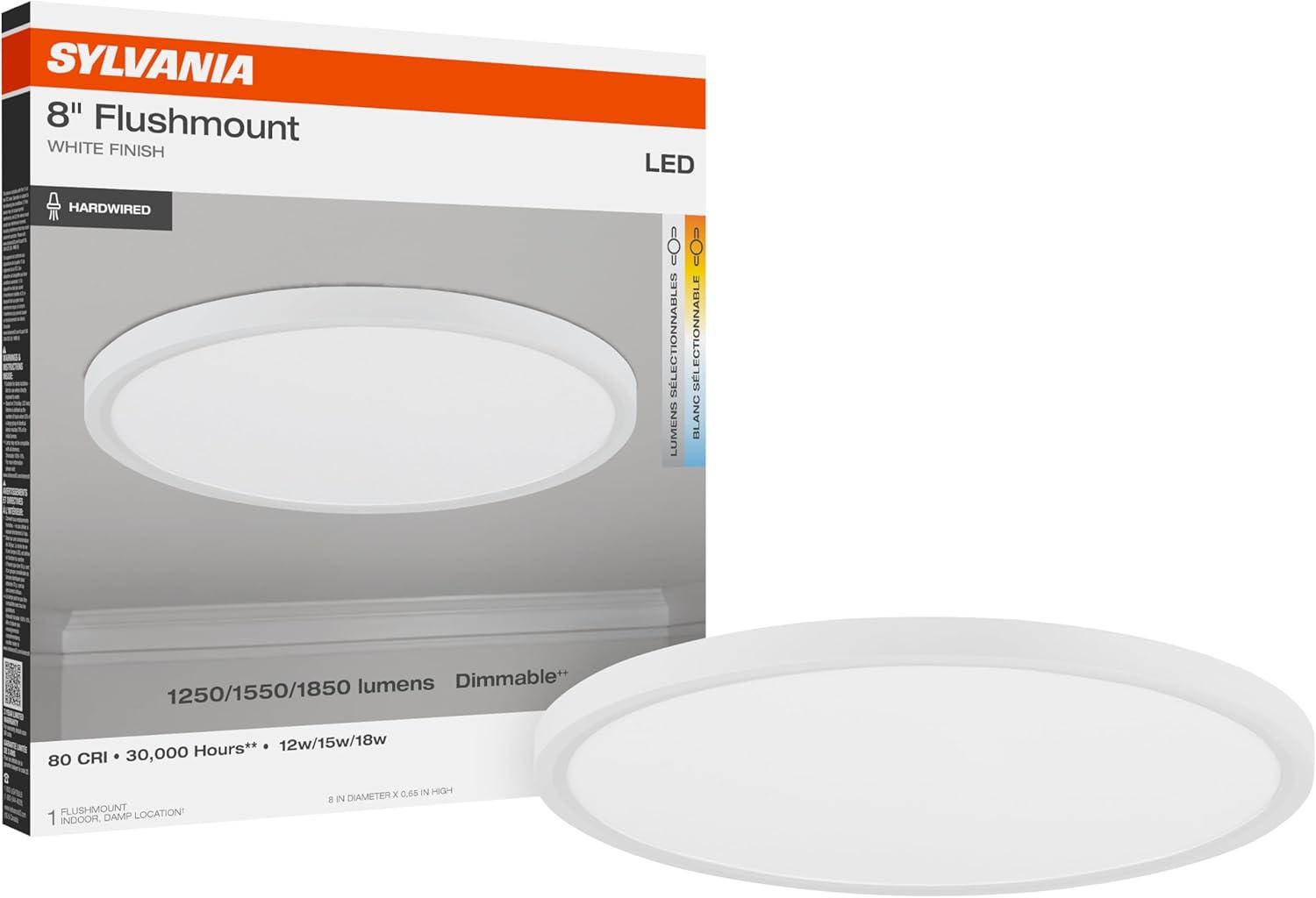 Sylvania 8" Dual Selectable Slim Ceiling Light Fixture, 12W/15W/18W, 1250/1550/1850 LMS, 5 Color Selectable (2700/3000 / 3500/4000 / 5000K), Dimmable, White Finish - 1 Pack (67280)