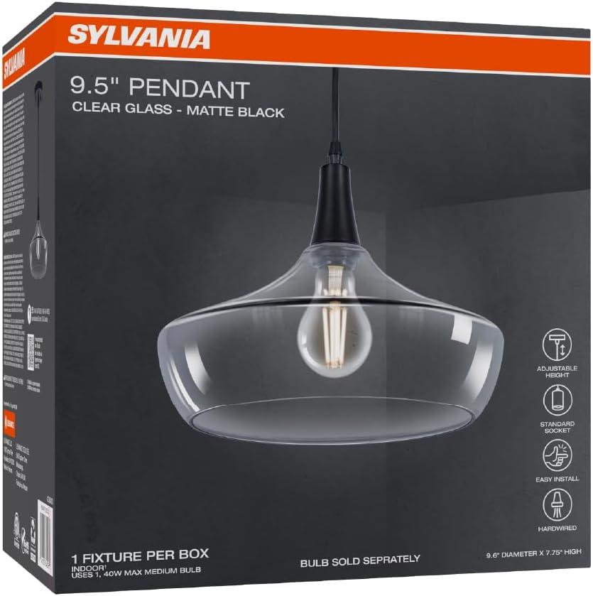 Elevate your home décor with the SYLVANIA 9.5″ Pendant Light Fixture with Clear Glass Shade. Designed with a sleek matte black finish, durable metal frame, and a chic clear glass shade, this pendant offers a stylish blend of modern and timeless design. Perfect for kitchens, hallways, foyers, stairwells, or over a kitchen island, it adds both function and elegance to any room. With its adjustable height up to 57″ using the included 45″ cord, this pendant accommodates a wide range of ceiling heights and layouts, including sloped ceilings. The fixture supports one standard E26 bulb up to 40W (bulb sold separately), giving you flexibility to choose LED or desired bulb that fits your lighting preference. This hardwired pendant light installs quickly and easily, making it a simple upgrade for indoor spaces. Engineered to last up to 50,000 hours and backed by a 5-year promise, the SYLVANIA pendant brings reliable performance and lasting style to your home.