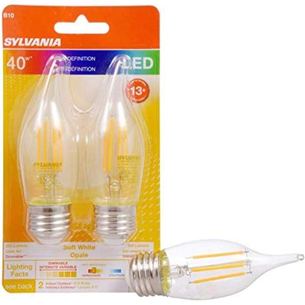 SYLVANIA B10 High-Definition LED Light Bulb, 4W Equivalent, 13 Year, Bent Tip, Medium Base, 320 Lumens, 2700K, Soft White, Clear - 2 Pack (40184)
