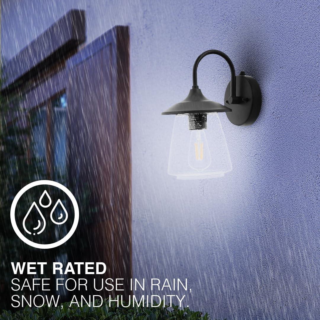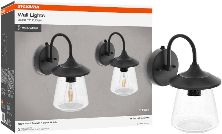 Brighten your home inside and out with the SYLVANIA Indoor/Outdoor Wall Lights (2-Pack). Designed with a sleek black finish and glass shade, these fixtures add a modern touch while offering reliable illumination for porches, patios, walkways, sheds, bathrooms, or even as accent lighting around mirrors. Featuring a built-in dusk-to-dawn photocell, these lights automatically turn on at night and off at sunrise, providing convenience and energy efficiency without the need for timers or switches. The versatile E26 base accommodates up to 100W bulbs, making it compatible with popular Edison ST19 filament or A19 bulbs to achieve your preferred look. Built to last, these wet-rated fixtures are engineered for both indoor and outdoor durability and backed by over 100 years of SYLVANIA’s trusted lighting innovation. Installation is quick and hassle-free with all hardware included—so you can enjoy dependable lighting with ease.