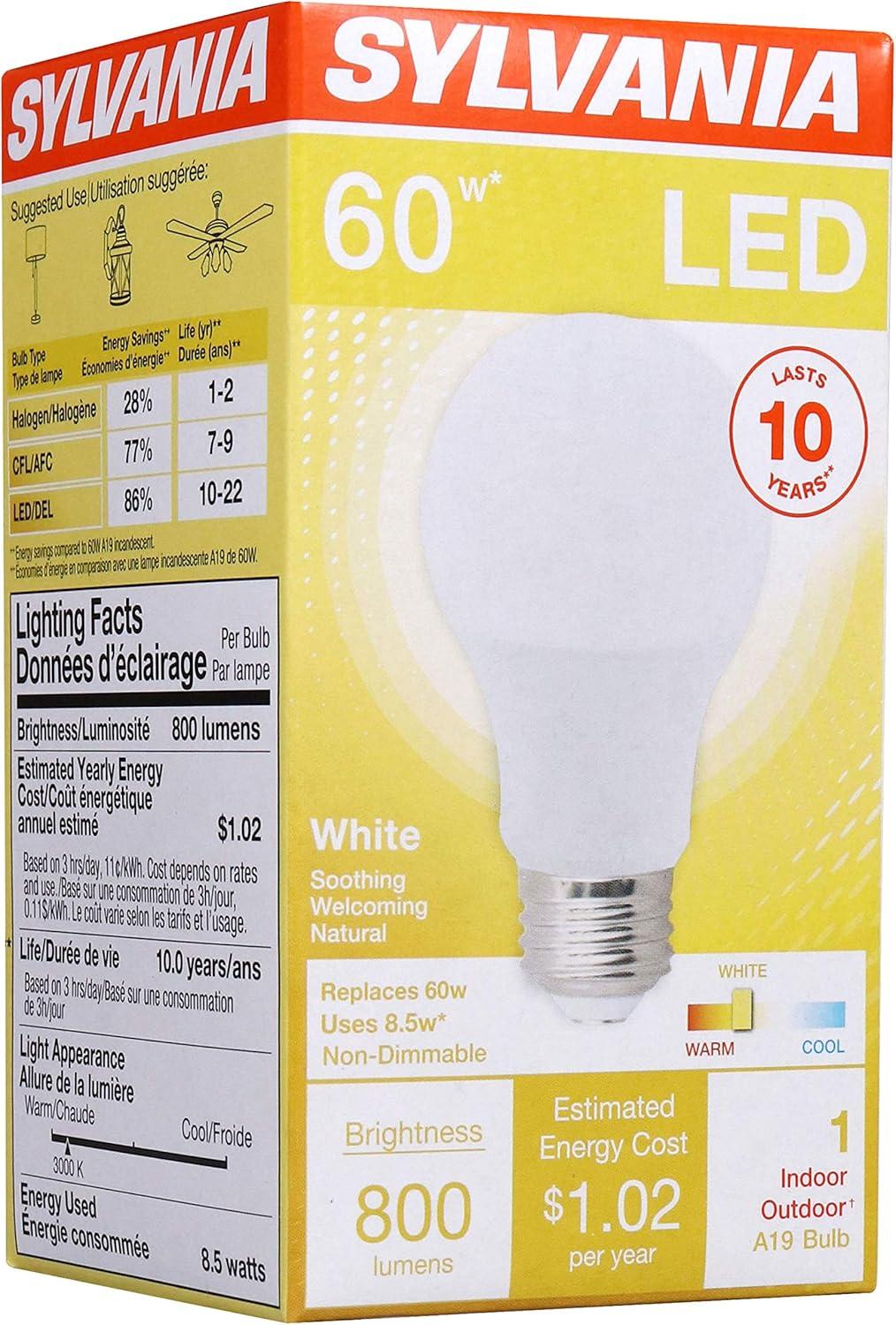 SYLVANIA LED A19 Light Bulb, 60W Equivalent, Efficient 8.5W, 10 Year, 2700K, 800 Lumens, Frosted, Soft White - 24 Pack (74765), Packaging may vary.(Bright White)