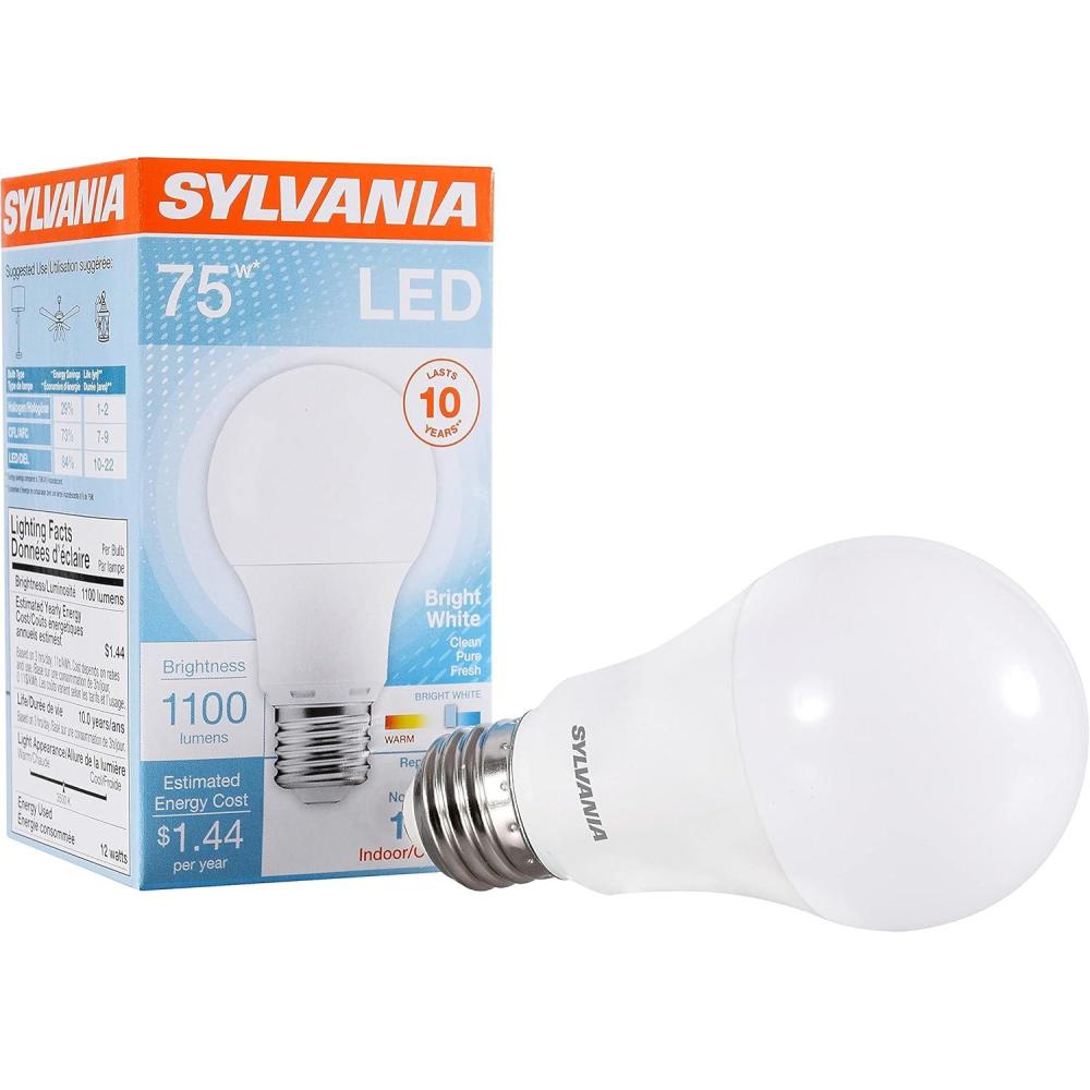 Brighten your home with a SYLVANIA 12W LED A19 bulb! This bright white LED lamp is a great replacement for your existing 75W incandescent lamp. With just 12 Watts, these lamps will brighten your house with 1100 lumens of light. Ideal for use in ceiling lights or floor lamps, the SYLVANIA LED bulb illuminates the house and adds dimensions with its bright white light. Additionally, it will help you save energy costs because it requires less energy and lasts longer than incandescent lamps. In fact, it has a lifespan of 11,000 hours. Keep your home well-lit and your electricity bill down with a SYLVANIA 12W LED A19 light bulb! See the clear difference it makes.
