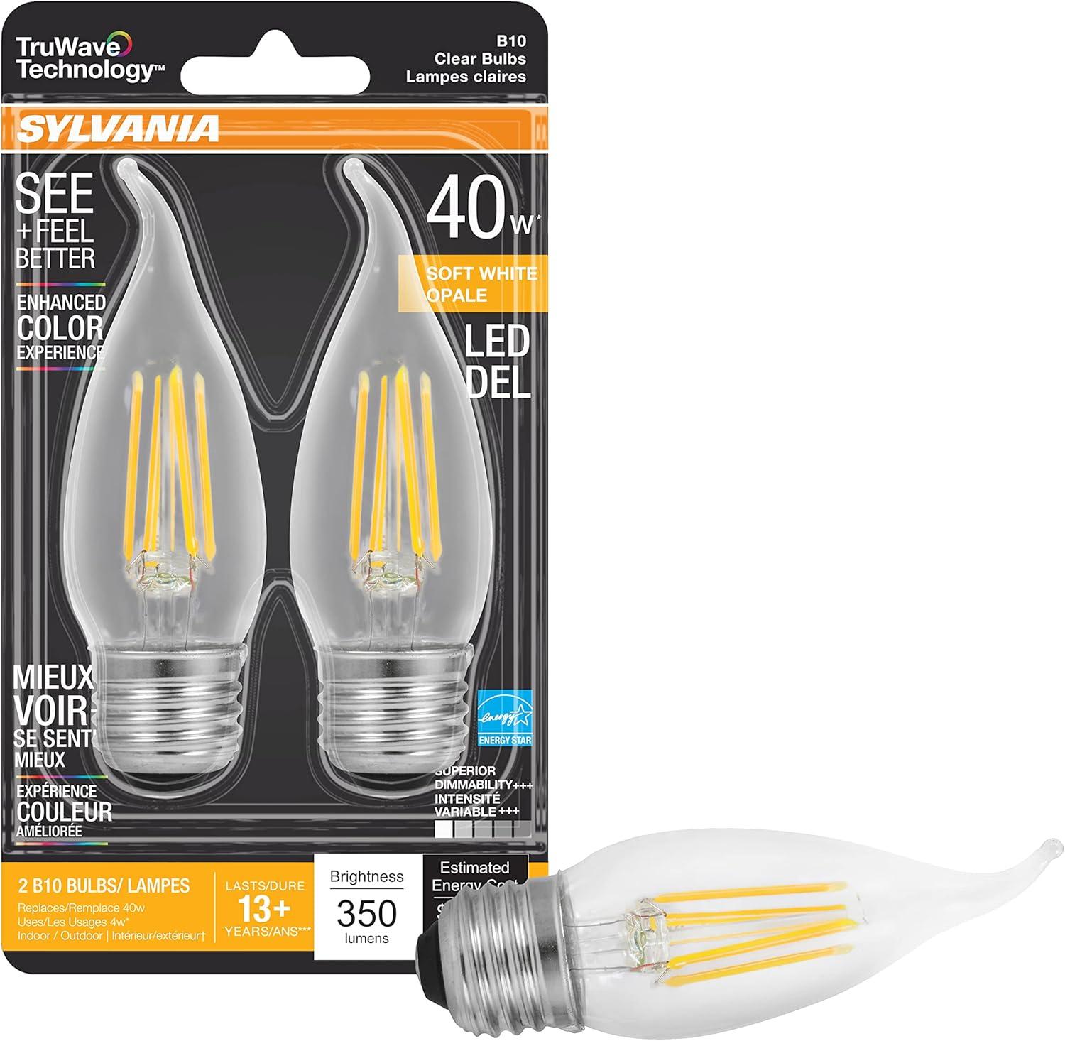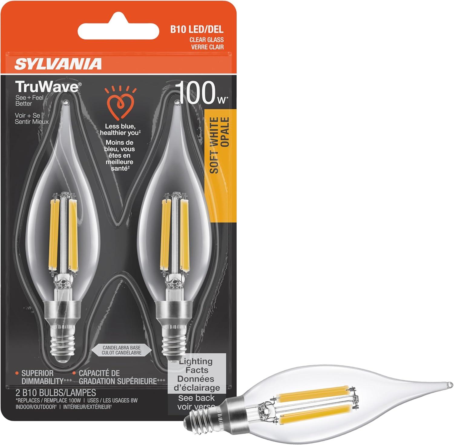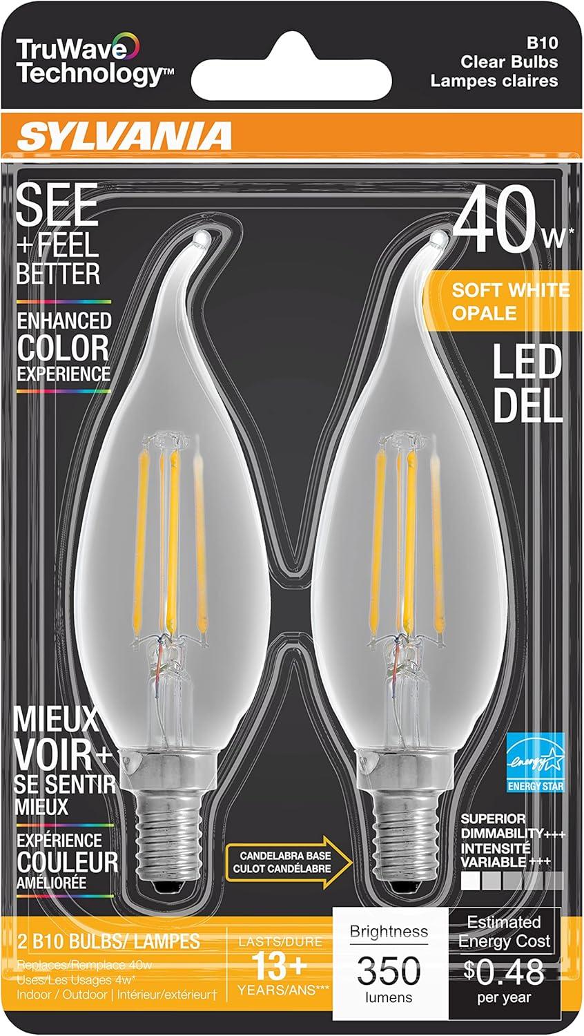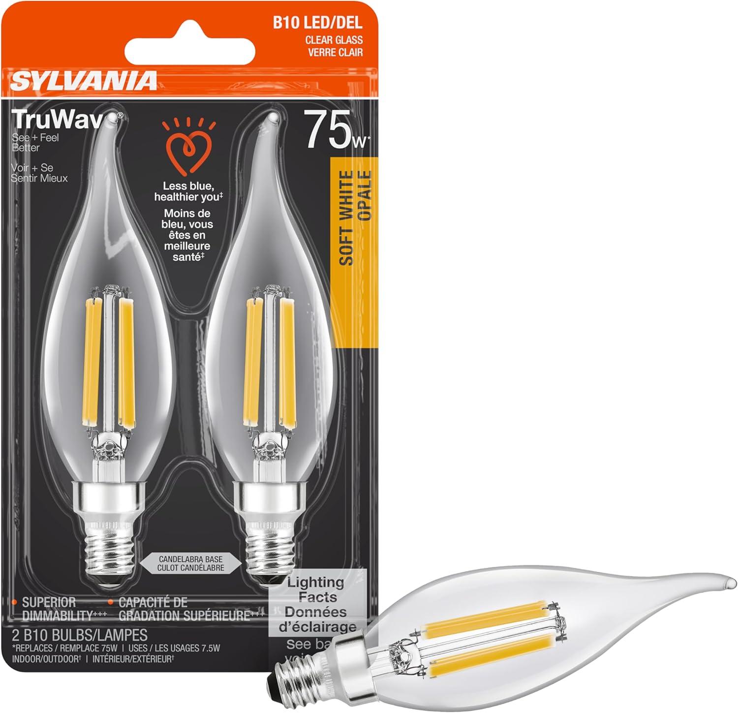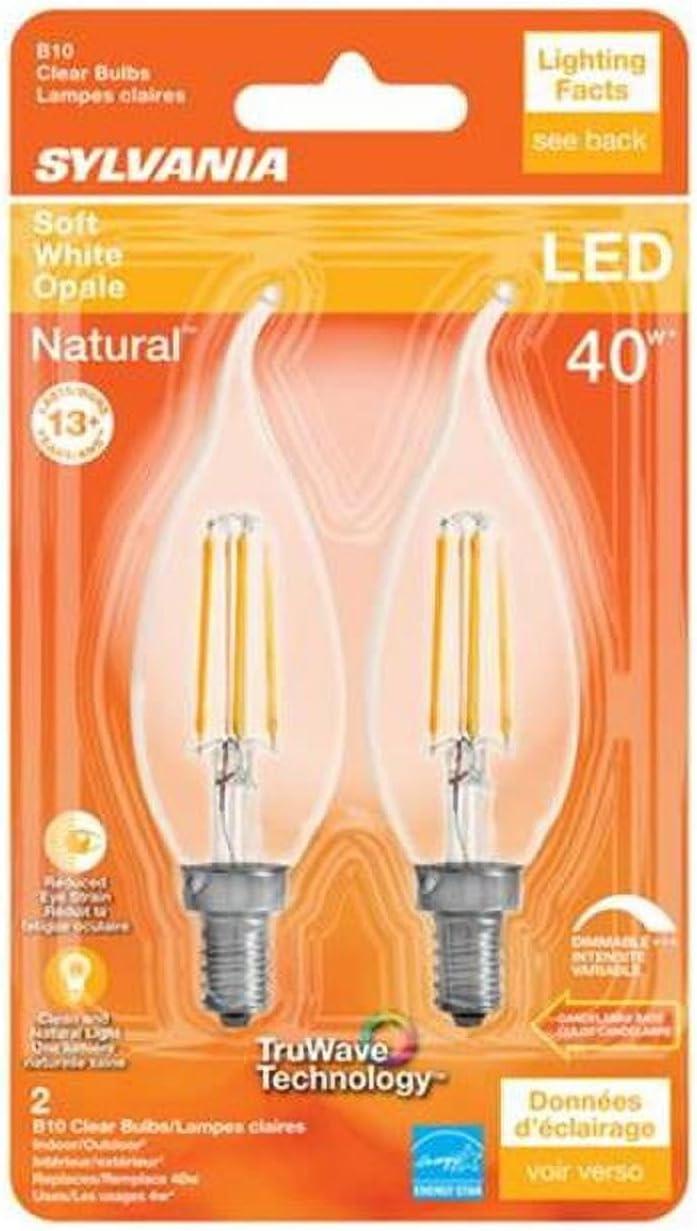 SYLVANIA LED TruWave Natural Series Candelabra Light Bulb, 60W Soft White Medium Base, Dimmable, Clear, Candle Tip – 2 Pack(Soft White)