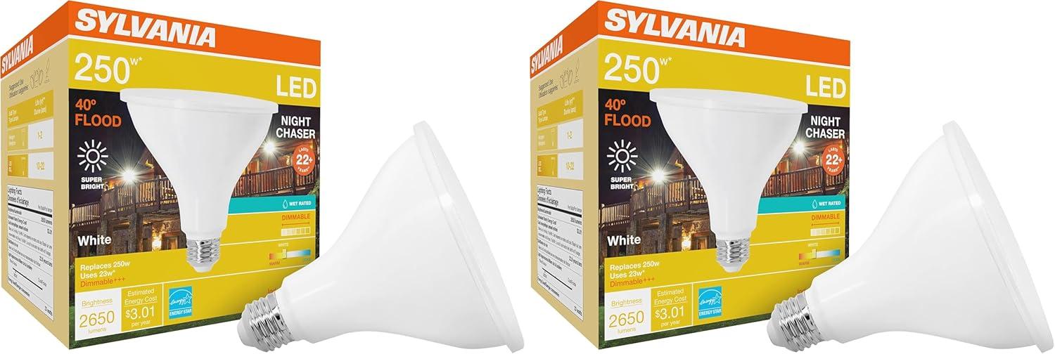 Light up your entire yard with 2,650 Lumens of bright light from the SYLVANIA Ultra LED Night Chaser PAR38 flood light. It can be mounted to a wall or deck to add a bright illumination over your walkway, garden, driveway, patio or backyard. These also are ideal for high ceilings indoors. Since they last up to 25,000 hours, this means less trips up the ladder to replace them. From helping to increase the safety and security of your home to improve the curb appeal, the SYLVANIA Ultra LED Night Chaser PAR38 flood light can help enhance your home.